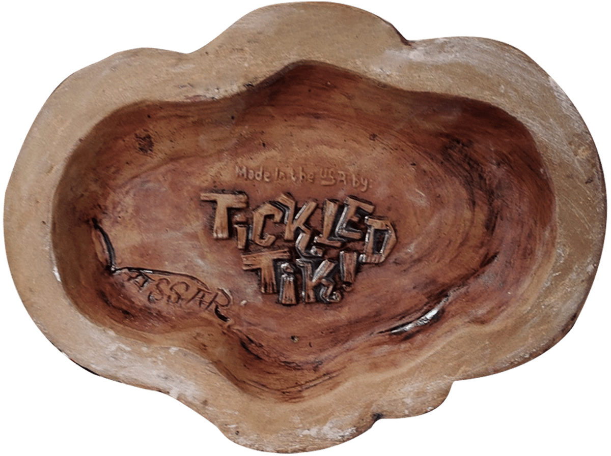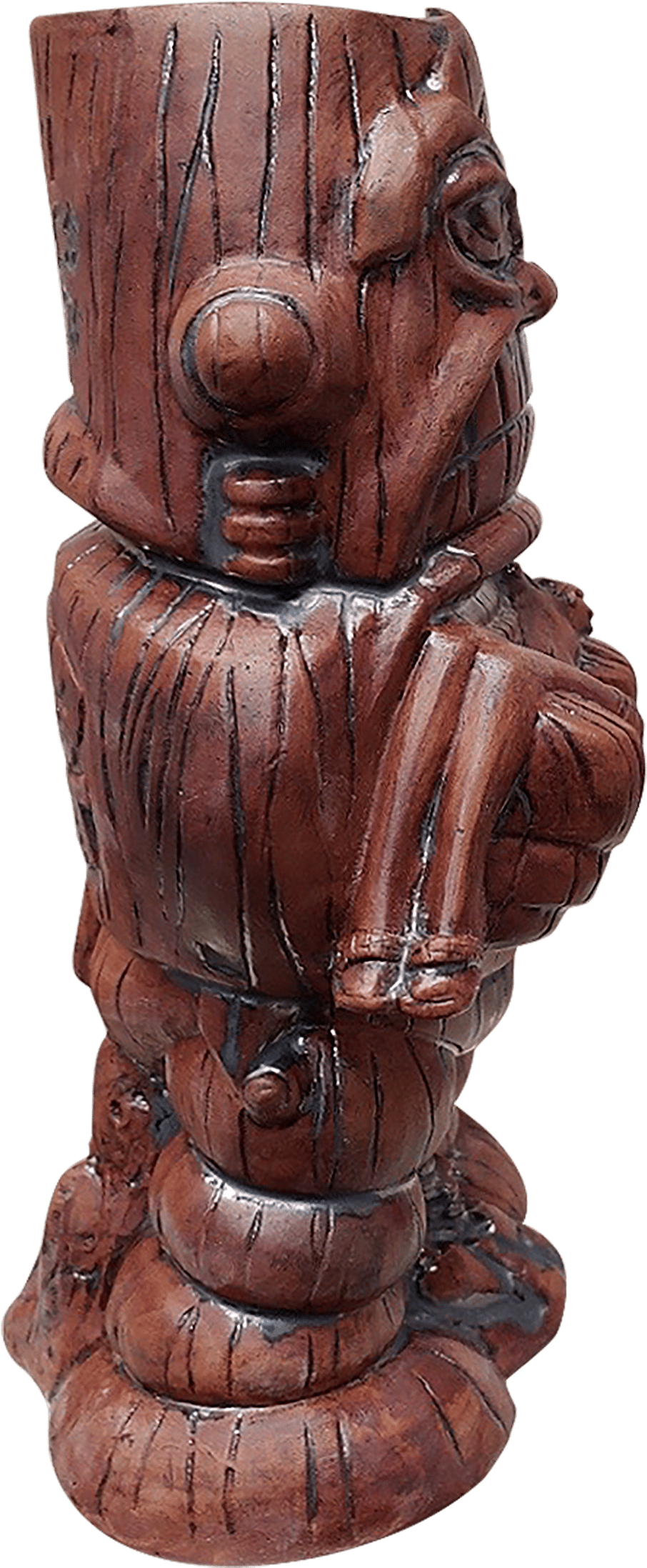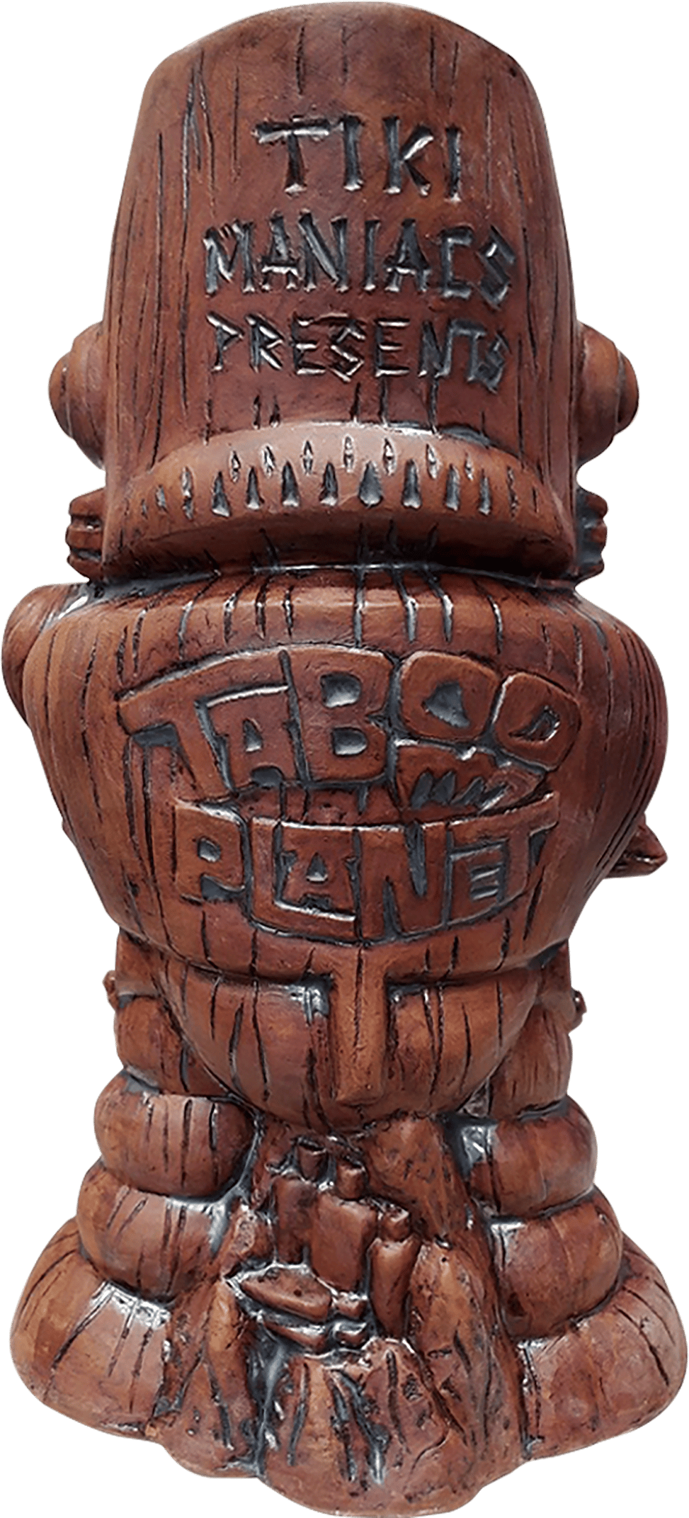 On your 2nd trip to Taboo Planet you explore deeper into the lush terrain and encounter the ruins of a once great village. What undoing led to their demise? This tiki mug mash-up was inspired by one of our favorite mid-century sci-fi movies. The mug was sculpted by Patrick Vassar and produced in the USA by Tickled Tiki. This edition features a brown matte finish with a charcoal wipe glaze. These mugs are hand made so no two will be alike.